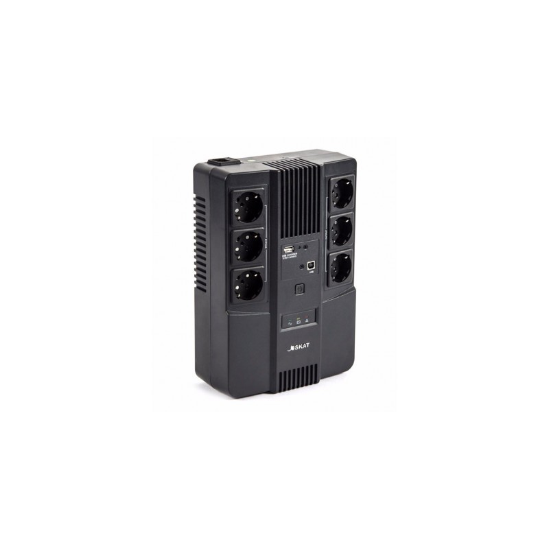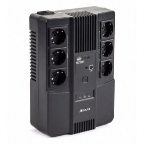220В, 800 ВА, (480 Вт), встроенный АКБ 9Ач, время резерва 3 мин., холодный старт, модифицированный синус, световая и звуковая индикация режимов работы, связь и управление ПК по USB. Встроенный стабилизатор (диапазон сети 170-270В), защита от всплесков напряжения, защита от перегрузки. 6 выходных разъема: 3 шт. CEE 7/4 (розетка с заземлением) с питанием от АКБ, 3 шт. CEE 7/4 (розетка с заземлением) без питания от АКБ