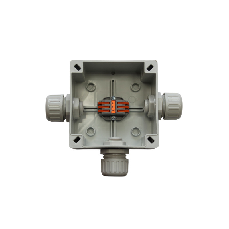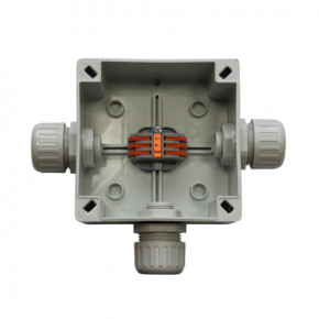 Коробки снабжены кабельными вводами для гофротрубы диаметром 20 мм. Внутри коробок размещена клемма соединительная на 3 входа и 3 выхода, позволяющая подключать провода с сечением жил до 4 мм. кв.