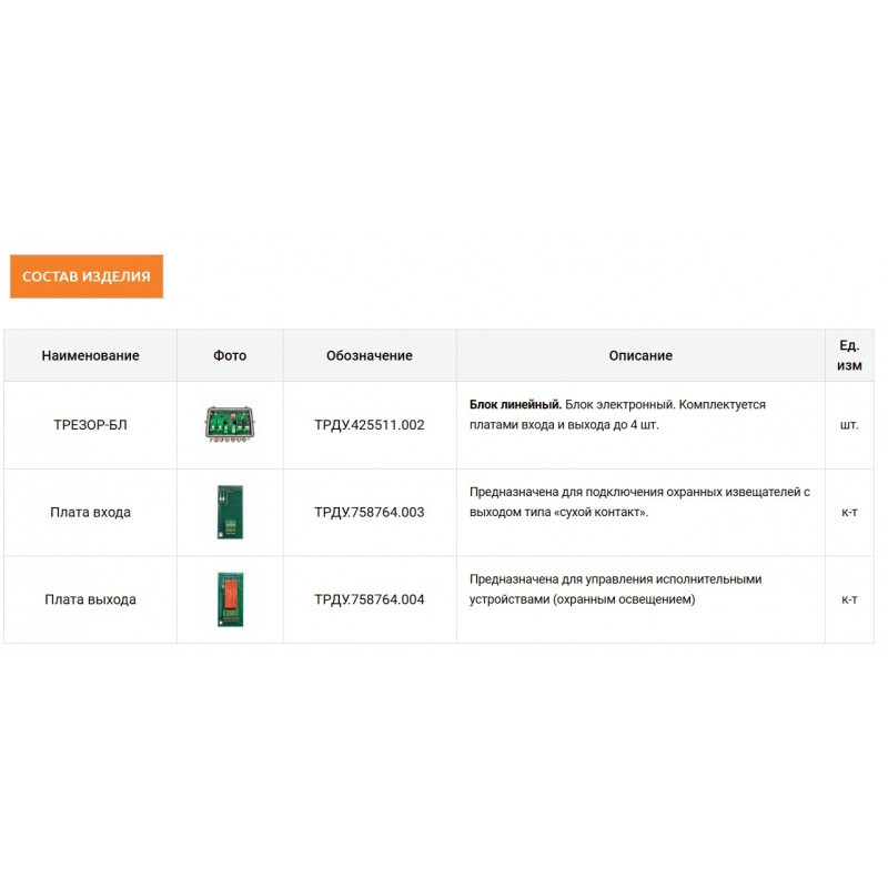 - При установке 4-х «плат входа» блок линейный «ТРЕЗОР-БЛ» функционирует как 4-канальный адресный расширитель, позволяющий подключить к системе охранной сигнализации периметра «ТРЕЗОР» / «ТРЕЗОР-ПРО», охранные извещатели или иные устройства с тревожным выходом типа «сухой контакт».