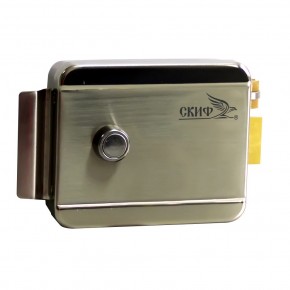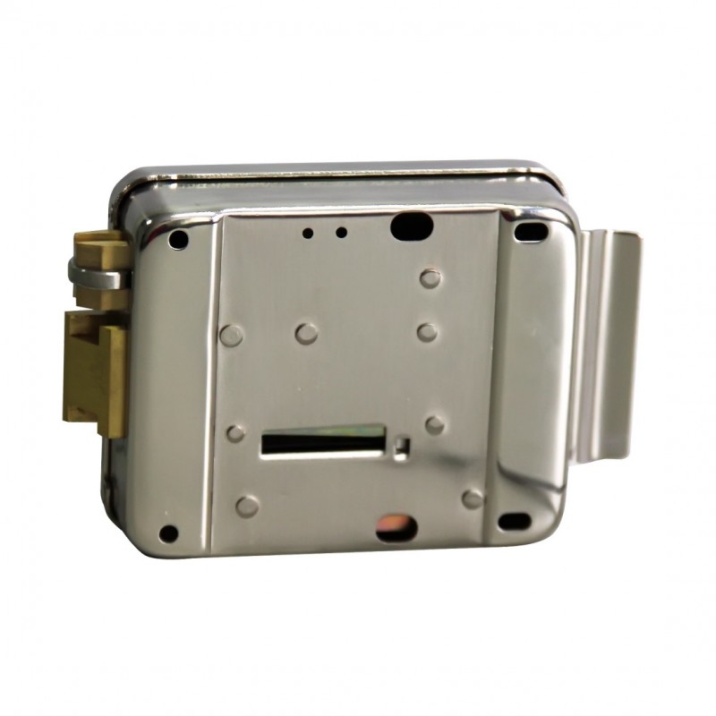 Электромеханический замок, накладной, ролик взвода пружины, отделка : никелированный, 12В, 1 А. Может быть установлен на двери, открывающейся как внутрь, так и наружу
