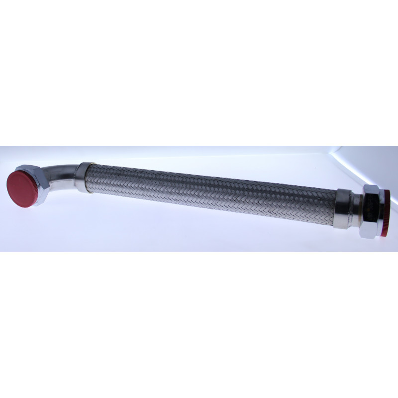 Рукав высокого давления (РВД) угловой предназначен для соединения выпускного штуцера запорно-пускового устройства (ЗПУ) МГП с коллектором. Возможно присоединение к распределительному трубопроводу установки газового пожаротушения. Длина РВД составляет 450 мм, DN40. Подключение РВД М56Х2