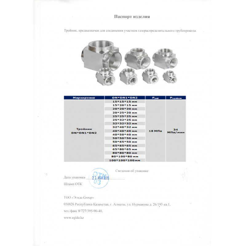 Тройник для соединения участков газораспределительного трубопровода. Рабочее давление 18 МПа, предельное давление 34 МПа.