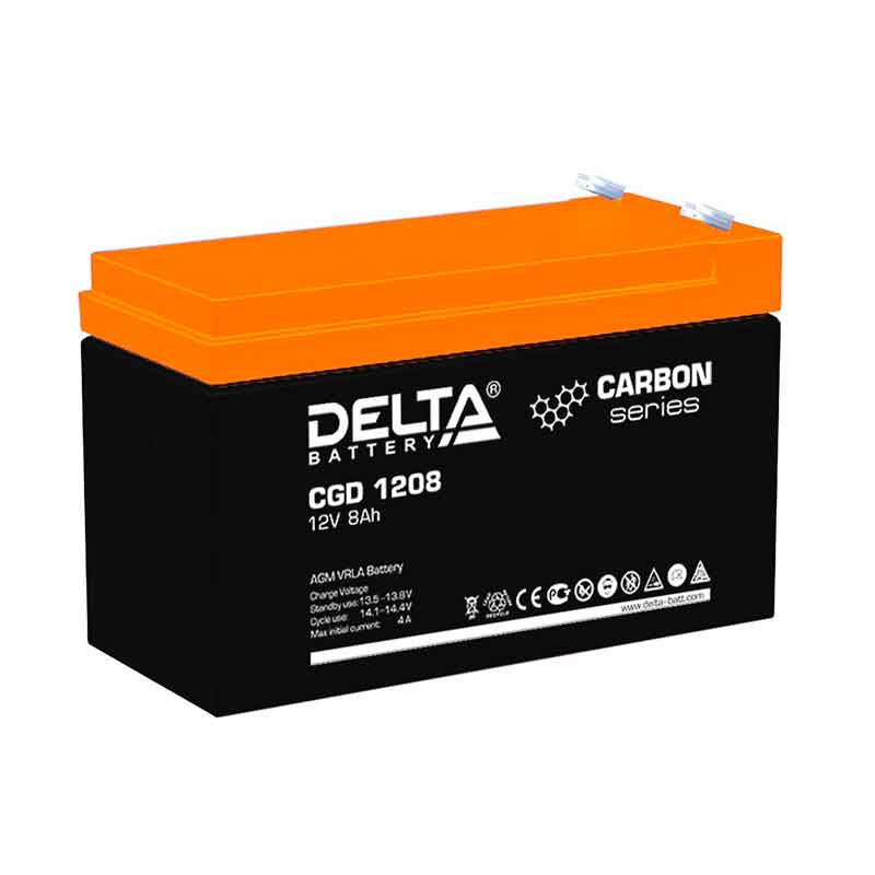 Свинцово-кислотный аккумулятор Delta новой линейки CGD выпускается с напряжением 12 В и ёмкостью 8 Ач. В основе лежит технология AGM, жидкий электролит удерживается внутри стекловолоконных сепараторов неподвижно. Отличительная особенность серии — карбоновое добавление, оно обеспечивает повышенную устойчивость к глубоким разрядам и температурному воздействию. Аккумулятор Delta CGD способен длительное время работать под высокой нагрузкой в тяжёлых режимах работы. Линейка с карбоновым добавлением может использоваться в циклическом и буферном режиме, в любом случае срок службы внушительный: до 1800 циклов заряда\разряда и до 15 лет в буферном режиме.