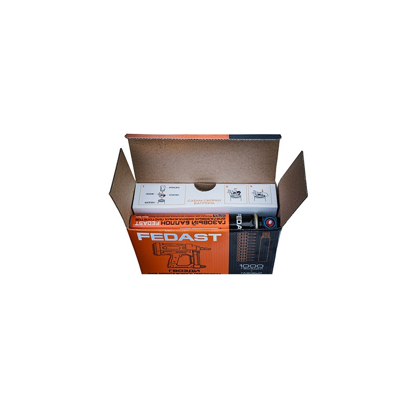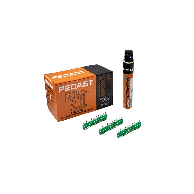 Гвозди поставляются в комплекте с газовым баллоном FEDAST 165 мм, совместимым с большинством производителей газовых монтажных пистолетов.
