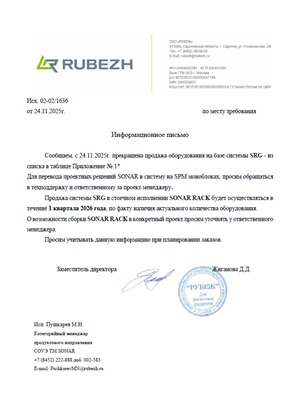 Компания Рубеж извещает о том что с 24.11.2025г. прекращена продажа оборудования на базе системы SRG - из списка в таблице Приложение № 1 ( Список прилагаем)