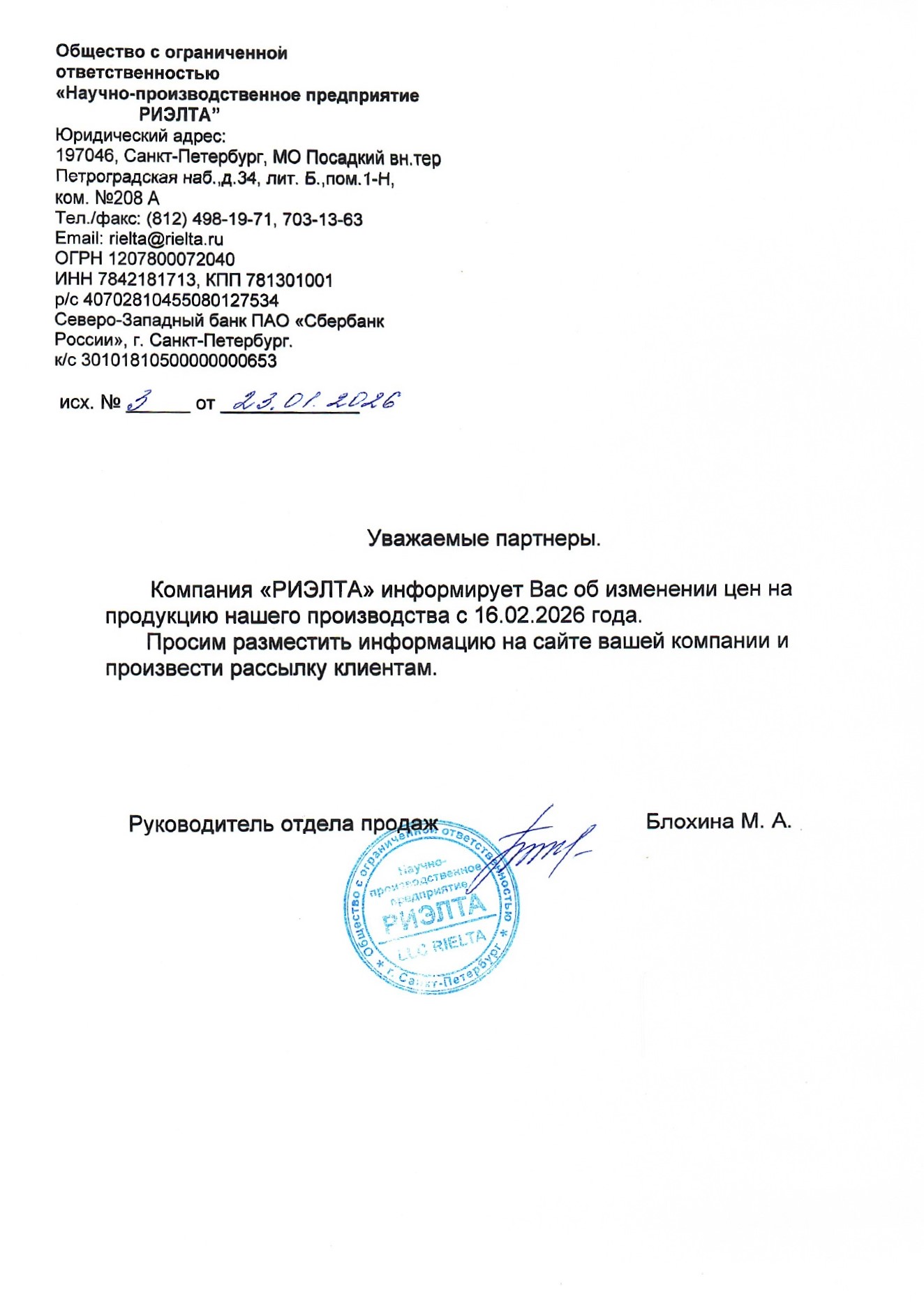 Компания «РИЭЛТА» информирует об изменении цен на продукцию собственного производства.