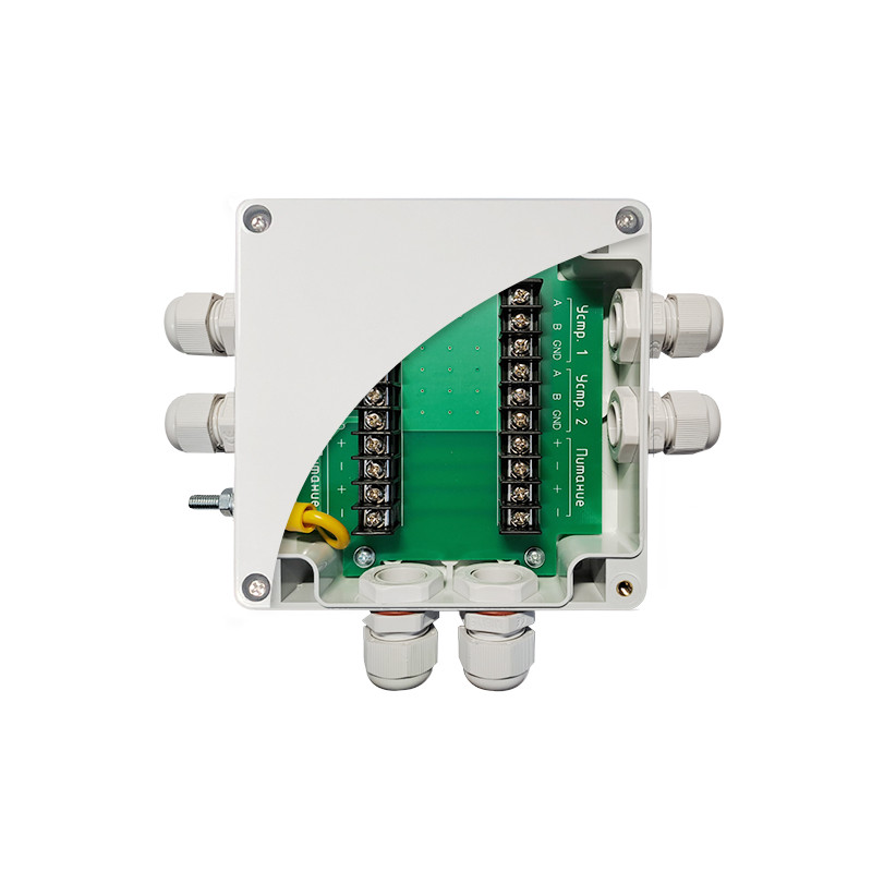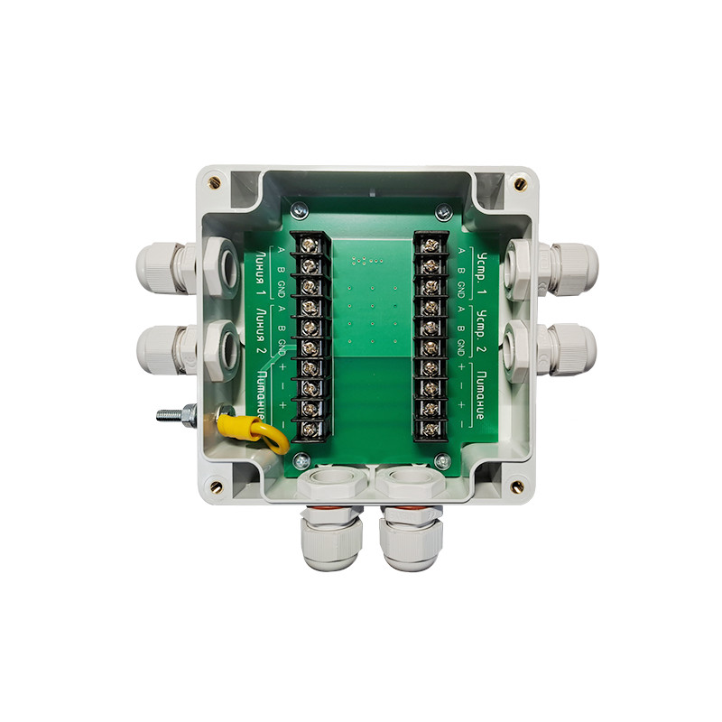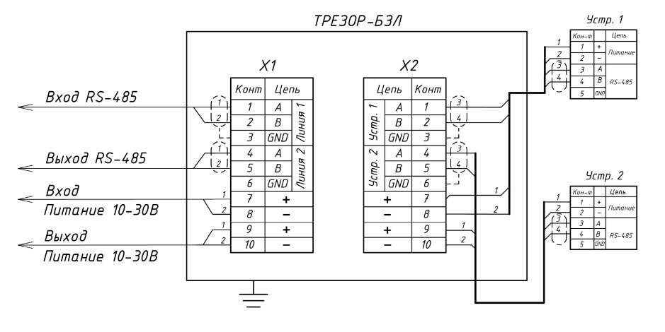 В герметичном корпусе блока защиты линии расположена печатная плата с двумя клеммными колодками, к контактам которых подключаются проводники линий интерфейса «RS-485». Для удобства подключения защищаемого оборудования в блоке «ТРЕЗОР-БЗЛ» предусмотрен транзитный вход и выход линии электропитания, а на клеммных колодках выделены отдельные контакты для подключения кабелей электропитания от устройств