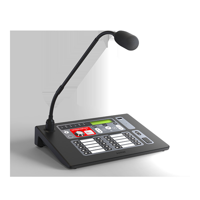 Пульт микрофонный СОУЭ Sonar SRM. Sonar SRM-7020: 20 зон, подключение к моноблокам SPM-B, SPM-С по интерфейсу DAP, доп. вход питания 24 В, прием сигнала АВАРИЯ (сухой контакт) от ИВЭПР.
