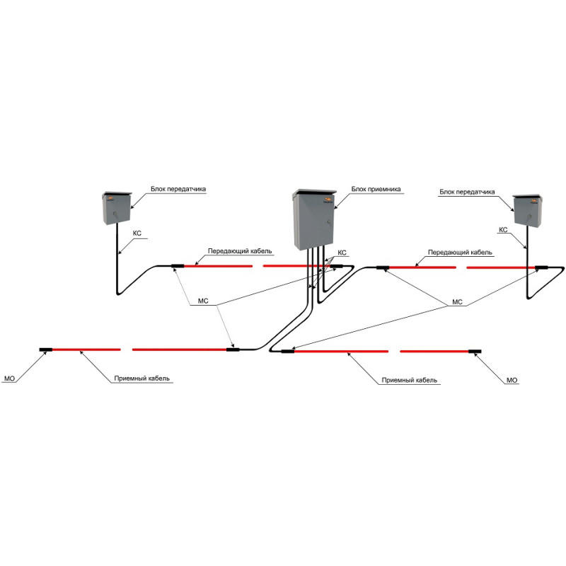 Зона обнаружения формируется двумя чувствительными кабелями (КЧ), которые выступают в качестве антенн (передающей и приемной). КЧ прокладывается в грунте или монтируется на заграждении. Передатчик, расположенный в блоке ПРД, вырабатывает высокочастотный сигнал, который излучается передающим кабелем, создавая вокруг распределение электромагнитного поля. С помощью приемного кабеля этот сигнал поступает в приемник, расположенный в блоке ПРМ . При пересечении нарушителем зоны обнаружения происходит перераспределение поля, что приводит к изменению сигнала на входе приемника. Эти изменения фиксируется схемой обработки и в соответствии с заданными настройками вырабатывается сигнал тревоги.